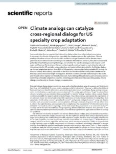 Chaudhary, S., Rajagopalan, K., Kruger, C. E., Brady, M. P., Fraisse, C. W., Gustafson, D. I., Hall, S. A., Hoogenboom, G., Melnick, R. L., Reyes, J., Stöckle, C. O., and Sulser, T. B. 2023. Climate analogs can catalyze cross-regional dialogs for US specialty crop adaptation. Scientific Reports 13:9317.