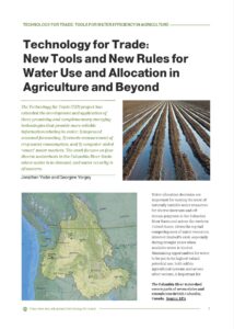 This research highlight summarizes outcomes from the Technology for Trade (T4T) project, a multi-year effort to improve water allocation and efficiency in the Columbia River Basin. The publication outlines three complementary innovations: improved seasonal forecasting, remote measurement of crop consumptive use, and computer-aided “smart” water markets. Seasonal forecasting work focused on translating climate outlooks into usable water availability metrics for agricultural decision-making. Remote sensing advancements improved the precision of evapotranspiration and consumptive use estimates using satellite imagery and modeling. The smart water markets component developed agent-based models and open-source “water market games” to simulate water trading scenarios under real-world regulatory constraints. The highlight also emphasizes the intersection of technology with legal, regulatory, and contractual frameworks necessary to protect water rights while enabling flexible transfers. Case studies focus on four Columbia River Basin watersheds: Yakima, Walla Walla, Methow, and Okanogan.